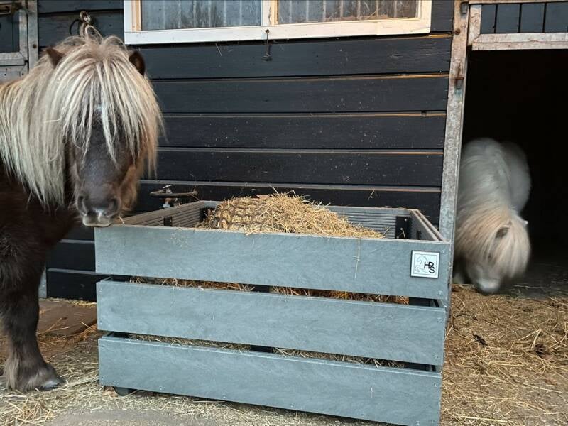 Onze slowfeeders worden gemaakt van gerecycled kunststof. Paarden zullen nauwelijks tot niet aan het kunststof knagen, in tegenstelling tot houten varianten. Dit verlengt de levensduur van je slowfeeder met jaren. De slowfeeders kunnen zowel binnen in stal als buiten in paddock of weiland gebruikt worden. Kunststof kan tegen alle weersomstandigheden en heeft geen onderhoud nodig. Doordat er kleine pootjes onder zitten, trekt vocht en vuil aan de onderzijde er niet in. Aan de zijkanten en onderzijde zitten kleine openingen, waardoor hooiafval er wel uit kan.