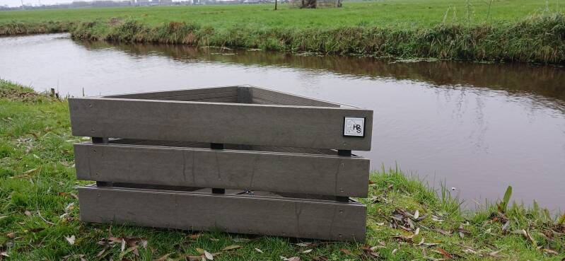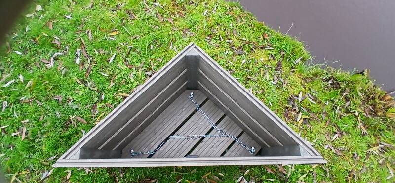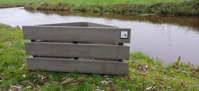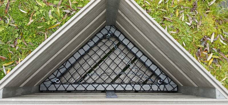 Een slowfeeder in een driehoekvorm, waardoor deze perfect past in een hoek, van bijvoorbeeld een stal of paddock.