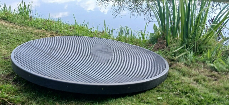 De diameter van de cirkel is 150cm en de hoogte ongeveer 15cm.